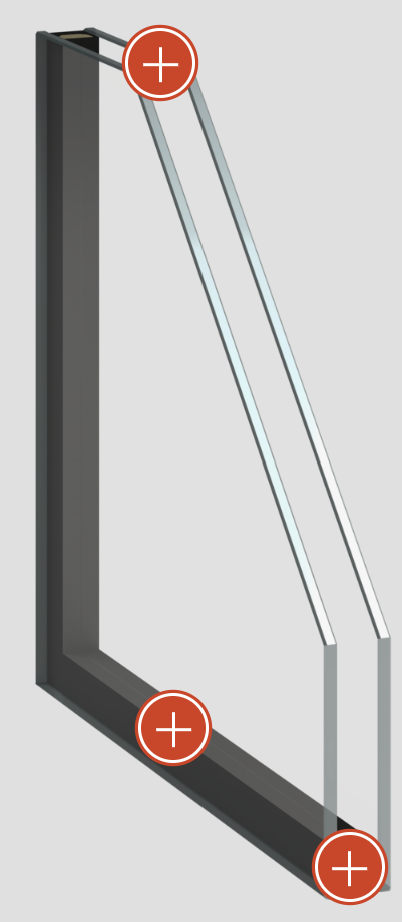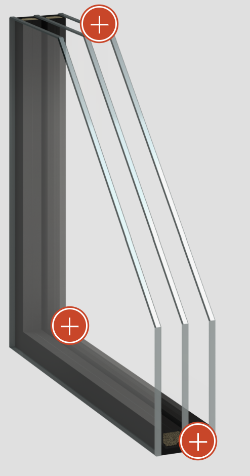 Bei der Dreifachverglasung stellen drei Scheiben und zwei gasgefüllte Zwischenräume die Verglasungseinheit. Die Glasscheiben werden zusätzlich mit einer Metallschicht bedampft, um weniger Wärmestrahlung durchzulassen.